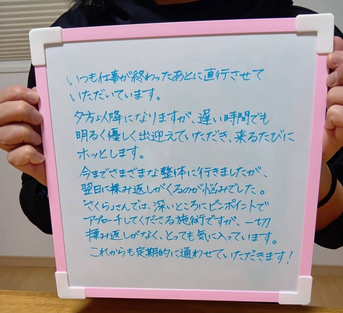 「さくら」さんでは、深いところにピンポイントでアプローチしてくださる施術ですが、一切揉み返しがなく、とっても気に入っています。