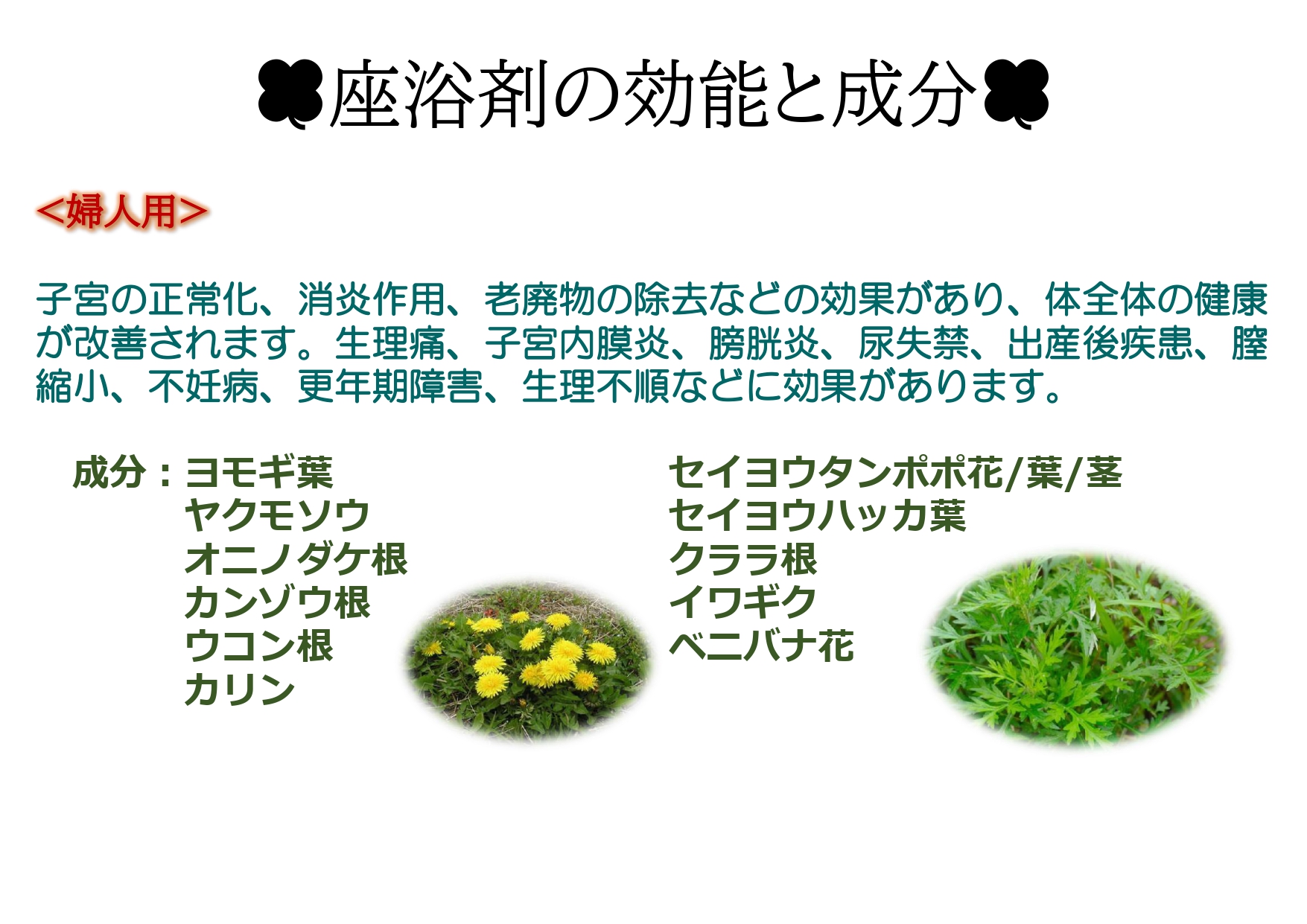 よもぎをはじめとした漢方生薬やハーブの成分を、女性器官に直接的に作用させることで、婦人科疾患や生理不順・更年期障害の予防や改善の助けとなります。また、不妊治療の一つとしてあげられることもあります。 さらに、体を芯からしっかりと温めることで冷え性の改善や免疫力の向上が見込まれます。