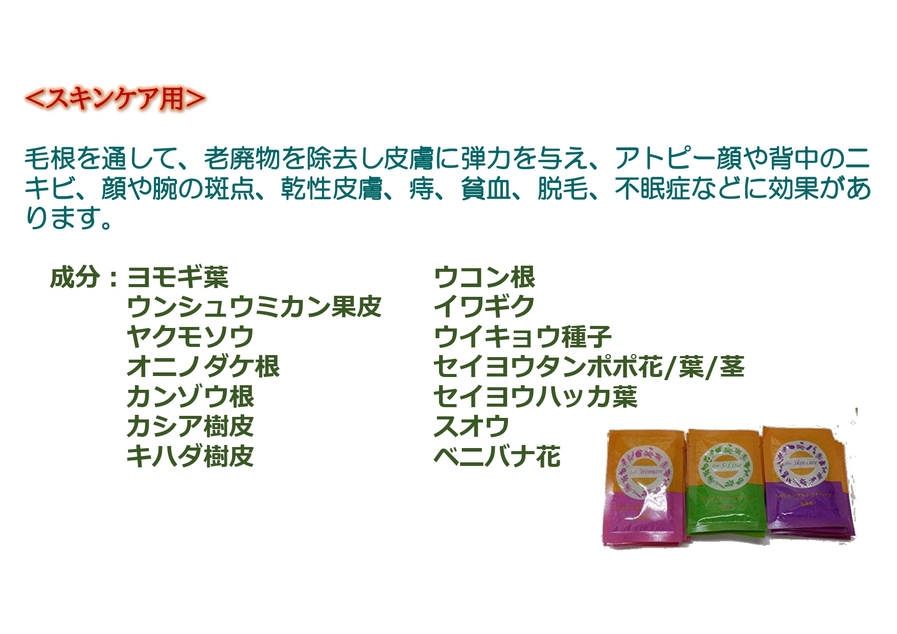 よもぎ成分に含まれるシネオール・セスギテルピン・アミラーゼ・アデニンコリン・ クロロカルシウム・ビタミンABCDが栄養を供給し、子宮や卵巣機能の低下などの 女性特有のトラブルによって出ているシミ・そばかす・吹き出物を解消して、 老化・肌荒れを回復させて肌に弾力とツヤ、透明感を与えます。また、老廃物の除去・殺菌により、綺麗な肌に変えてくれて、アレルギー性肌にも 効果があるとも言われています。